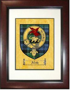 Your scottish clan crest / scottish clan badge & tartan proudly displayed on a High Quality 11 inch x 14 inch Framed Print.