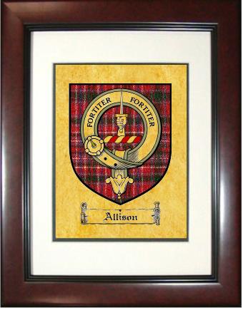 Your scottish clan crest / scottish clan badge & tartan proudly displayed on a High Quality 11 inch x 14 inch Framed Print.