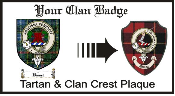 Your scottish clan crest / scottish clan badge & tartan proudly displayed on a High Quality Plaque.