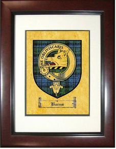 Your scottish clan crest / scottish clan badge & tartan proudly displayed on a High Quality 11 inch x 14 inch Framed Print.