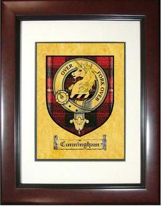 Your scottish clan crest / scottish clan badge & tartan proudly displayed on a High Quality 11 inch x 14 inch Framed Print.