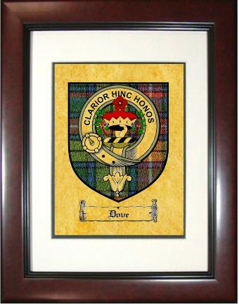 Your scottish clan crest / scottish clan badge & tartan proudly displayed on a High Quality 11 inch x 14 inch Framed Print.