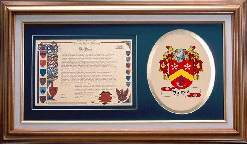 Your Scottish Coat of Arms proudly displayed along with your Family Name History. Gold Framed Print measures 29 inches by 17 inches.