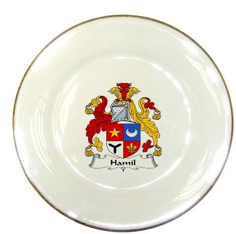 Your Scottish Coat of Arms proudly displayed on an elegant ceramic plate. White ceramic plate with gold trim. Plate stand also included.