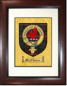 Your scottish clan crest / scottish clan badge & tartan proudly displayed on a High Quality 11 inch x 14 inch Framed Print.