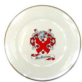 Your Scottish Coat of Arms proudly displayed on an elegant ceramic plate. White ceramic plate with gold trim. Plate stand also included.
