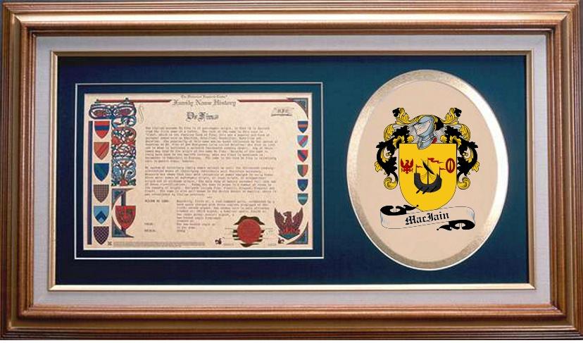 Your Scottish Coat of Arms proudly displayed along with your Family Name History. Gold Framed Print measures 29 inches by 17 inches.