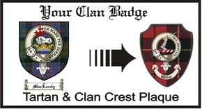 Your scottish clan crest / scottish clan badge & tartan proudly displayed on a High Quality Plaque.