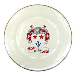 Your Scottish Coat of Arms proudly displayed on an elegant ceramic plate. White ceramic plate with gold trim. Plate stand also included.
